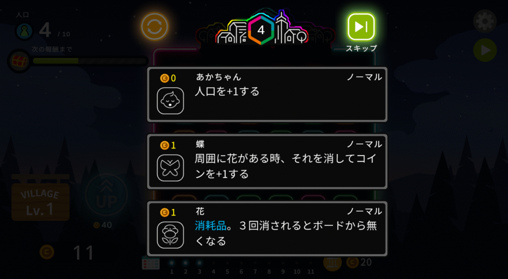 また月日がすぎたりある一定の条件を達成するとこのようにパズルに組み込むピースを選択することができるようになります。上に書かれてる4というのが現在デッキに入ってるパネルの総数になります。